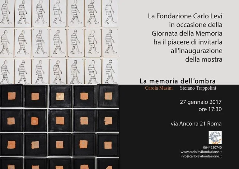 La Fondazione Carlo Levi, per celebrare la Giornata della Memoria 2017, per la prima volta ha commissionato dei lavori site specific a due artisti contemporanei, Carola Masini e Stefano Trappolini. La memoria dell’ombra è il titolo scelto per una doppia suggestiva installazione: due grandi lavori composti di numerosi pezzi, collocati su due pareti affrontate che, dopo un’ampia introduzione di vuoto, saturano lo spazio conclusivo della Fondazione.