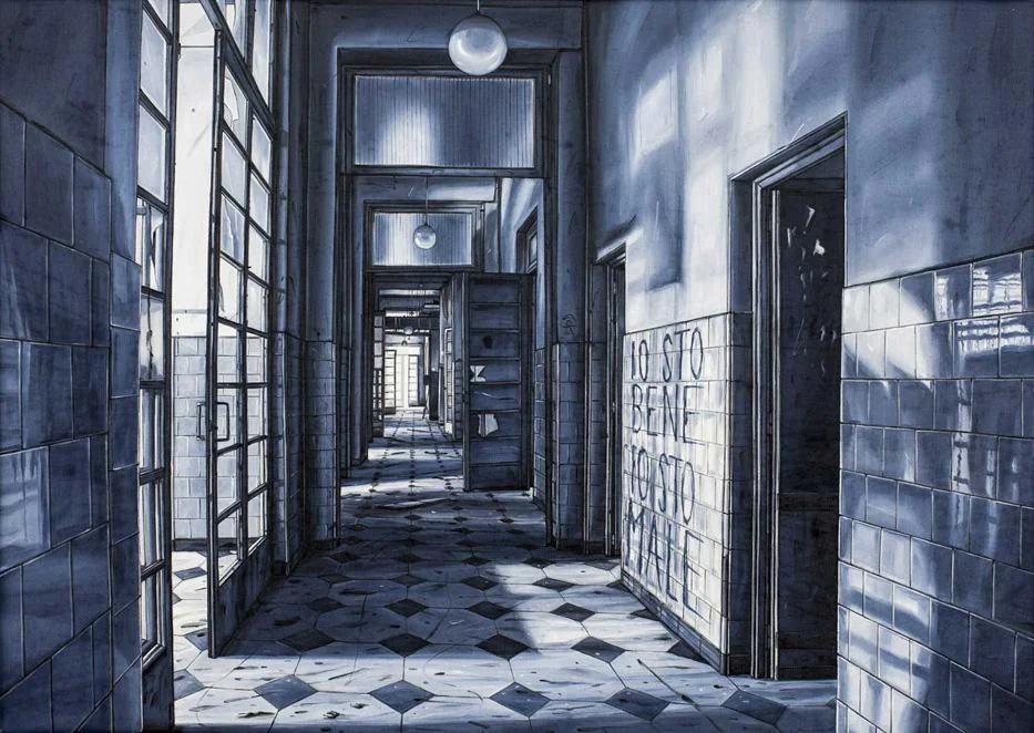 La mostra, allestita nelle sale della galleria, è concepita come una grande installazione composta prevalentemente di dipinti a olio su lino, disegni a inchiostro e pennarello su carta, pastelli a olio, che alludono però al comportamentismo dell’artista: esplora luoghi abbandonati, strizza l’occhio all’automatismo fotografico, riproduce in velocità per favorire la contemplazione in studio. La realtà si trasforma mediante la pittura che permette a Chiesi di modificare ciò che vede, alterando i micro e macro particolari che ritiene più significativi. Anche la cromia delle sue opere merita una riflessione: il nero e il grigio si mescolano a una serie di gradazioni di azzurro, il dipinto così ottenuto prende le distanze dal bianco e nero di certa fotografia di documentazione architettonica, così come dalla visione a colori tipica del nostro sistema percettivo. In questo modo l’artista instaura un dialogo differente col suo interlocutore, spostando l’attenzione dalla realtà a un piano personale e immaginario.