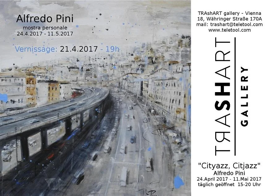 Saranno 24 i dipinti esposti presso la galleria Trashart di Vienna in occasione della mostra personale di Alfredo Pini dal titolo “cityazz, citjazz” che si terra’ dal 21 aprile al 11 maggio 2017. Si tratta di opere eseguite tra il 2014 e il 2016, raffiguranti immagini di città e musicisti jazz. Prevale in tutti i dipinti di Alfredo Pini un’idea di movimento, intesa non soltanto come azione ma anche come metafora di trasformazione inarrestabile di una società che cambia a ritmi frenetici. Allora ci si deve fermare a pensare, a meditare, l’uomo ha necessità di riappropriarsi del proprio tempo e dedicare spazio a se stesso, intervengono a questo punto nella pittura di Pini, come valida metafora a sottolineare questo concetto, i musicisti Jazz. Opere, quindi, non soltanto ispirate dalla musica, ma capaci di raccontare e raccontarsi nella duplice veste emozionale legata sia alla musica in sé che al concetto intimista attribuitogli dall’artista. Le pennellate veloci, sicure quasi fossero sciabolate di colore, le sgocciolature, il dripping sapientemente dosato, la vernice a spray, contribuiscono a suscitare un’idea di estemporanea freschezza di una pittura emozionale, carica di suggestioni di estrema contemporaneità.