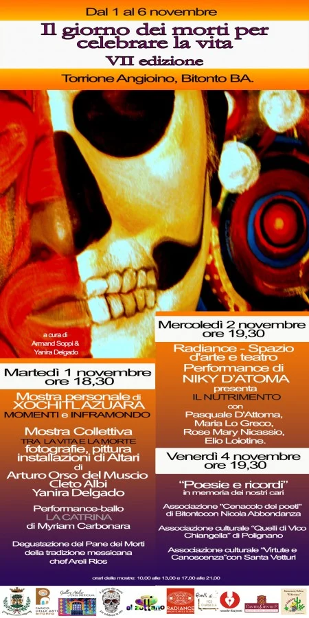 Per il settimo anno consecutivo, il comune di Bitonto, l’Associazione messicana El Zottano insieme a Gallery-Atelier Casa Mexicana presentano la manifestazione “Il giorno dei morti per celebrare la Vita” ideata dall’artista messicana Yanira Delgado.