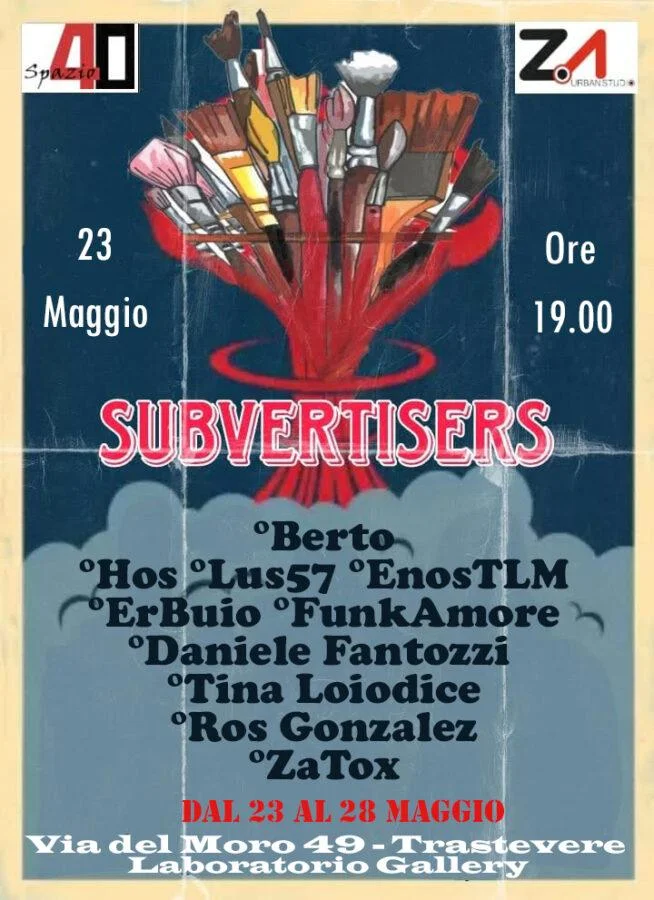 La mostra Subvertisers, a cura di Spazio 40 Art in collaborazione con Za.Urbanstudio, inaugura il 23 maggio 2023 alle ore 19.00 presso la Galleria Il Laboratorio di Via del Moro n. 49 a Trastevere e sarà visitabile tutti i giorni fino a domenica 28 maggio 2023.
