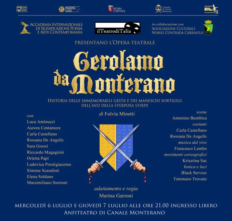 Il TeatrodiTalia di Bracciano e l’Accademia Internazionale di Significazione Poesia e Arte Contemporanea, in convenzione formativa con l’Università degli Studi di Roma Tre, con accreditamento dalla Regione Lazio, iscrizione all’albo di Roma Capitale, con il patrocinio del Comune di Canale Monterano e della Riserva Naturale Regionale di Monterano, in collaborazione con l’Associazione Culturale Nobile Contrada Carraiola, presentano in anteprima assoluta: Gerolamo da Monterano. Historia delle immemorabili gesta e dei maneschi sortilegi dell’avo della sterposa stirpe, di Fulvia Minetti, regia di Marina Garroni.