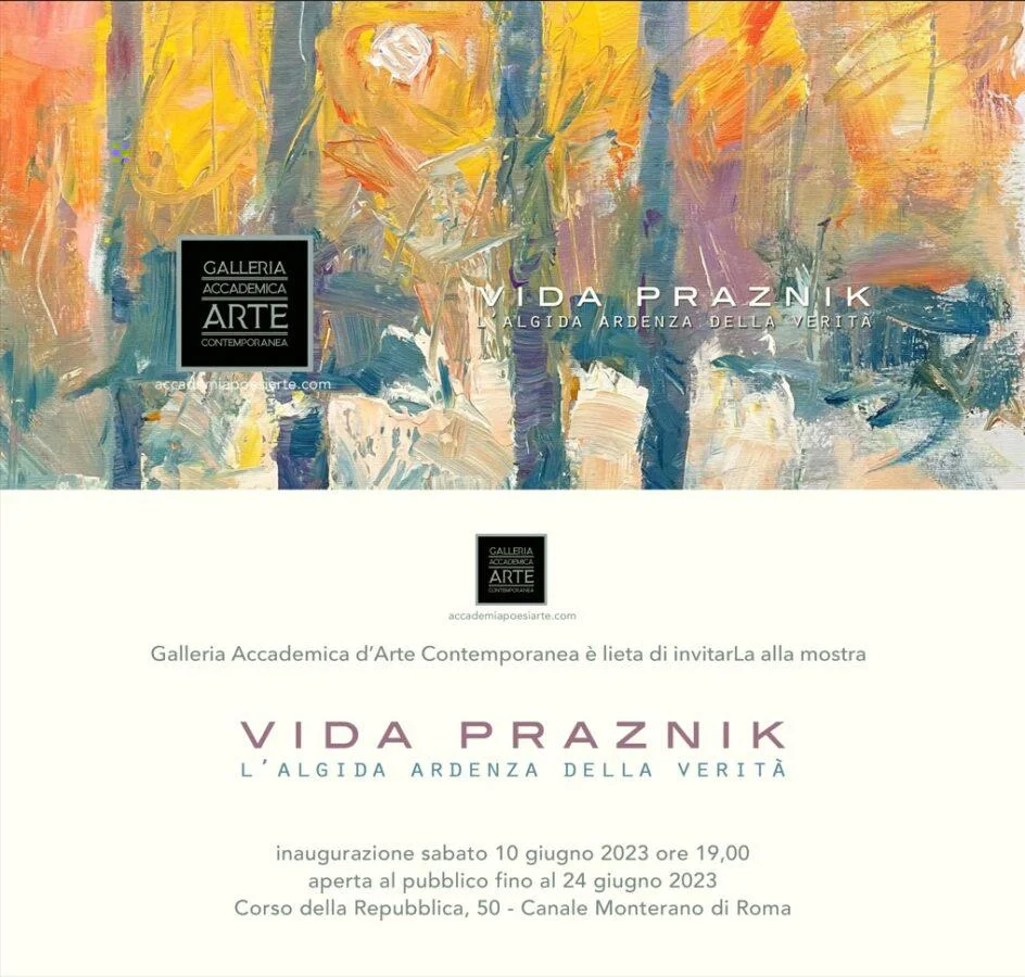 L’Accademia Internazionale di Significazione Poesia e Arte Contemporanea, in convenzione formativa con l’Università degli Studi di Roma Tre, accreditata dalla Regione Lazio, iscritta all’albo di Roma Capitale e del Comune di Canale Monterano, presidente fondatrice la prof.ssa Fulvia Minetti, vicepresidente il dott. Renato Rocchi, direttore artistico Antonino Bumbica, inaugura la mostra di Vida Praznik con catalogo edito alla Galleria Accademica d’Arte Contemporanea della Città d’Arte Canale Monterano di Roma in Corso della Repubblica n.50 il 10 giugno 2023 alle ore 19.00, aperta al pubblico fino al 24 giugno 2023 ore 10,30-12,30 con ingresso gratuito.
