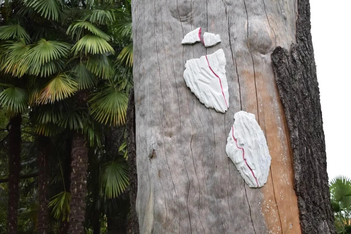 «La vita della donna – scrivono Francesca Baboni e Stefano Taddei – è continuamente costellata da ostacoli e difficoltà, dall’infanzia fino all’età matura. Riuscire a declinarle in tutte le sfaccettature è sicuramente una capacità che l’artista Marika Ricchi ha insita nella sua poetica. Non a caso abbiamo scelto lei per creare un percorso esplicativo di una vita al femminile. Attraverso una serie di installazioni, Marika Ricchi esegue un’attenta calibrazione di un vissuto, tracciando le linee di demarcazione tra lei stessa e l’esistenza. Nell’installazione “Bagno 87” (Piazza Lenin) l’autrice ricorda, anche visivamente, la propria provenienza romagnola. I colori delle cabine sono quelli di un tempo che è stato ma che, artisticamente, si ripropone in un luogo, Cavriago, che paradossalmente non ha il mare, creando un contrasto straniante ed evocativo. Nella serie “Gli occhi di Venere” (parco del Multiplo) si riportano differenti acconciature che ricordano il potere seduttivo che hanno tali pettinature. La posizione e i colori, a cerchio, di questi sei marmi ricordano le differenze che sussistono nella femminilità ma anche come tale parte del corpo viene spesso sfregiata e utilizzata per brutalizzare le donne. Dall’acconciatura di una persona si può intendere anche il carattere, la cura che pone verso la propria persona. E proprio contro questo sovente la violenza si scatena. In “Touch wood” (parco del Multiplo) siamo davanti ad una ricostruzione di un frammento di manualità che sa creare, mentre i segni sulla parte visibile del rilievo rimandano alla memoria, personale e universale e in “Pink Line” (parco del Multiplo) la corteccia si unisce al filo segnando tappe esistenziali. Sul pergolato viene evidenziata, ulteriormente, la violenza che abita la nostra attualità nell’opera “Piedi intrecciati” (Piazza Lenin). Si trovano difatti piedi di gesso colorati fattosi sculture, legati con corde. Un estremo monito alla costrizione nel proseguire, a quelle violenze che si arrecano ai corpi e che non possono che farci riflettere sulla nostra congiuntura. Sembriamo esseri progrediti, ma la bestialità sembra sempre pronta ad uscire».