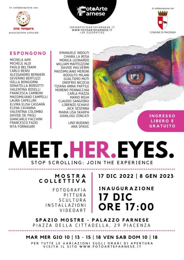 Nella cornice del palazzo storico simbolo della città di Piacenza e antica residenza dei Farnese signori del Ducato di Parma e Piacenza si inserisce la suggestiva e ricca esperienza della mostra collettiva Meet.her.eyes. organizzata da Maria Lisa Skarpa e Tiziana Anna Paffile del Collettivo FotoArte Farnese in collaborazione con l’Associazione culturale Sine Tempore.