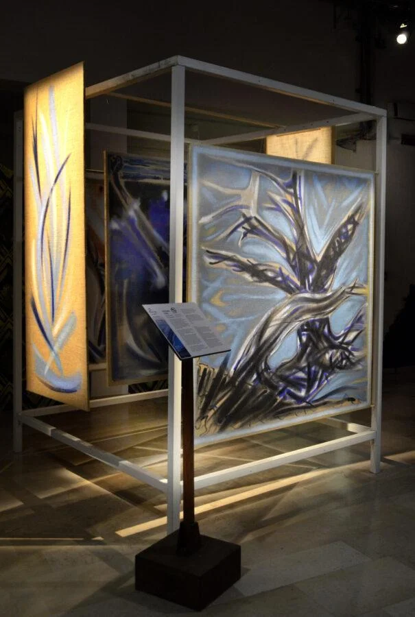 “Trasparenze e trascendenze”, ambientazione doppiamente scenica, opere che diventano quinte teatrali e che, accavallandosi l’un l’altra, generano visioni per poi progressivamente sfumare in un'ignota dimensione, oltre la contingenza, sulla soglia di un sacrario in attesa di una rivelazione che forse potrebbe arrivare...