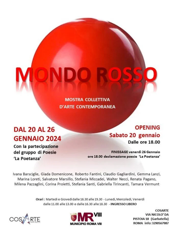 Dal 20 al 26 gennaio 2024 si terrà la Mostra collettiva ‘Mondo Rosso’, con il patrocinio del Municipio Roma VIII, presso la galleria Cosarte nel cuore di Garbatella.