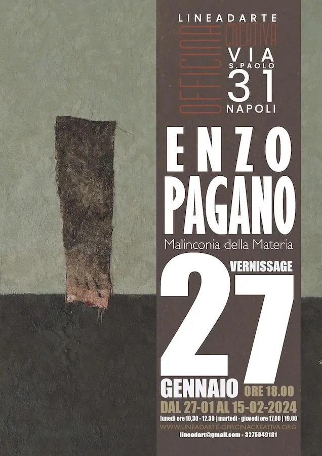 Inaugura sabato 27 gennaio 2024 alle ore 18 presso Lineadarte Officina Creativa, isola creativa laboratorio della libere arti, via San Paolo, 31 Napoli, la mostra personale di Enzo Pagano , dal titolo “Malinconia della Materia ” a cura di Gennaro Ippolito e Giovanna Donnarumma, interverrà il professore Stefano Gallo “Università di Roma Tor Vergata”.