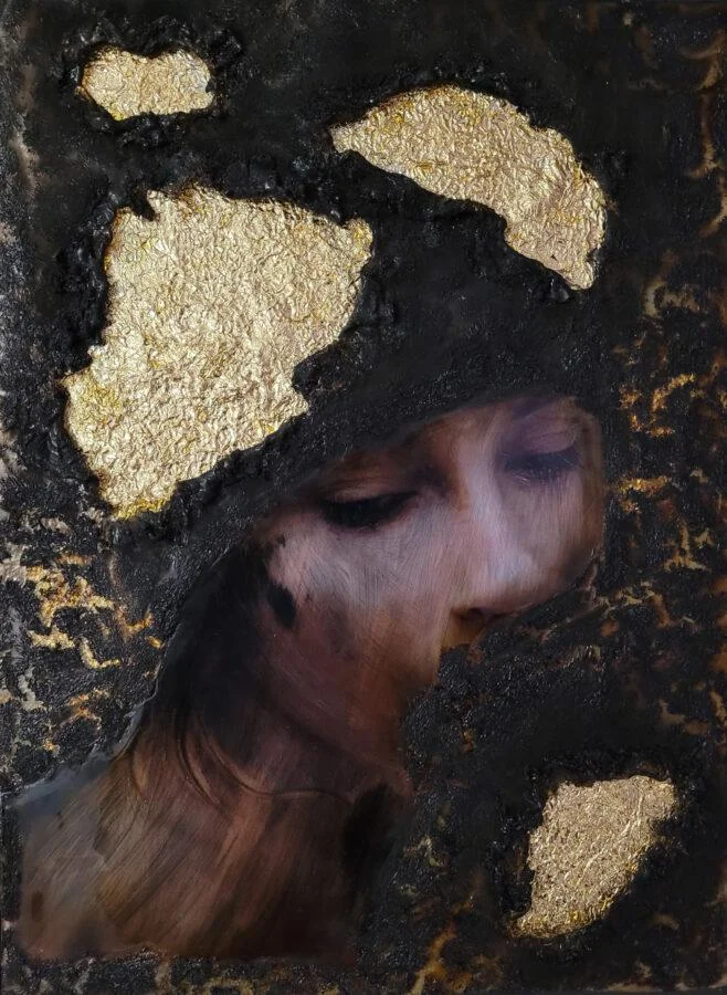 I materiali impiegati, poi, rendono ancora più materico i lavori della Nesteri e l'oro utilizzato non ha una mera finalità decorativa, ma è impiegato per dare dinamicità e intensità agli sguardi, talvolta anche disarticolandoli.