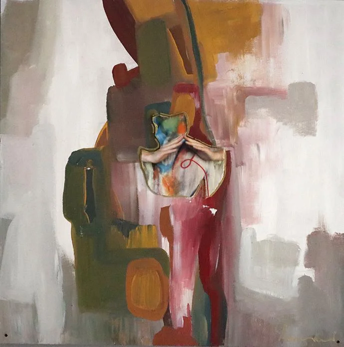 I dipinti della Scannavini ripercorrono invece la storia cromatica del velo con la quale si avvolse Alice. I colori della passione, della delicatezza, della trasparenza sono fusi nelle sue tele per rimarcare la visione della potenza della vita. La Scannavini addirittura inserisce dei ritagli delle foto di Ilaria per creare nuovamente quella Fusione a testimonianza di un corpo di puerpera che contiene una nuova vita che sta per risplendere, ma ancora per alcuni istanti è contenitore di nuova vita prima d’intraprendere il suo viaggio verso il mondo esterno.