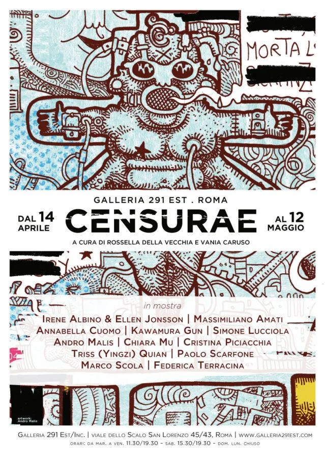 Censurae sarà, infatti, l’eterogeneo sguardo degli artisti Massimiliano Amati, Annabella Cuomo, Simone Lucciola, Andro Malis -la sua fanzine Nextasy 06 è stata rielaborata per la grafica promozionale dell’evento- Cristina Piciacchia, Paolo Scarfone, Marco Scola e Federica Terracina; con la compartecipazione internazionale dell’italo-greca Irene Albino e della svedese Ellen Jonsson, della cinese Triss (Yingzi) Qian, del giapponese Kawamura Gun e la consolidata incursione dei suoi iconici Nudisti Timidi, che da sempre ascrivono il tema della censura al falso pudore comune. Infine, Censurae sarà anche la performance di Chiara Mu, prevista a chiusura del vernissage, che si terrà venerdì 14 aprile 2023 a partire dalle ore 18:30.
