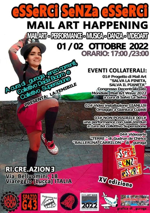 Arrivata alla sua XV edizione, l'1 e il 2 ottobre torna a Viareggio, nello spazio Ri.cre.Azion3 "Esserci Senza Esserci", MAIL ART Happening, che vedrà quest'anno la partecipazione di oltre 130 artisti provenienti da diverse parti del mondo operanti nel campo della mail art.