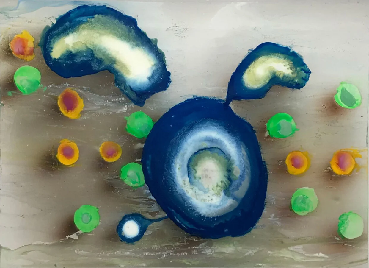 La struttura di ogni opera è composta quindi come l’espressione di un pensiero non verbale, trasformato in una struttura articolata e consolidata nella rivelazione della realtà. Dove si raccoglie un esercizio stilistico capace di trasformare un desiderio, nell’ironia della creatività, in una dilatazione del tempo e dello spazio. Macchie, segni veloci, prepotenze cromatiche, si contengono la definizione dello spazio, contendendo alla natura e alla poesia la inquieta ricerca delle soluzioni formali dell’opera. Coadiuvato dall’utilizzo di materiali plastici e pitture sintetiche in chiave sperimentale il suo campo di investigazione si concentra in un’astrazione che si estende da suggestioni geologiche allo spazio e si articola in una visione dinamica della forma. La coesione di intenzionalità e accidentalità si sedimenta nella proliferazione di “dots)” e “circles” cromatici che liberandosi in un moto vorticoso restituiscono senso dello spazio e profondità, al tempo stesso agiscono come “dissuasori visivi” negando la stessa profondità attraverso densità irregolari, contrastando la continuità strutturale e compositiva. I “circles” e successivamente i “drops” sono caratterizzati da una gamma cromatica che varia dalle metallizzazione ai colori acidi descrivendo esplosioni e vortici.
