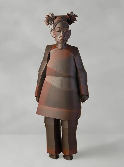 Figlio di migranti cinesi, King dedica la sua ricerca all’esplorazione delle connessioni tra la cultura orientale e quella occidentale nella determinazione della sua identità. Ne emerge una scultura “costruita” tagliando e piegando il cartone, che evoca la lezione della ritrattistica orientale insieme alle forme e ai colori del Cubismo Analitico per indagare le dinamiche della società contemporanea, globale e itinerante, attraverso la propria storia personale.