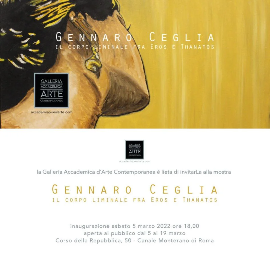 L’Accademia Internazionale di Significazione Poesia e Arte Contemporanea, in convenzione formativa con l’Università degli Studi di Roma Tre, accreditata dalla Regione Lazio, iscritta all’albo di Roma Capitale e del Comune di Canale Monterano, presidente fondatrice la prof.ssa Fulvia Minetti, vicepresidente il dott. Renato Rocchi, direttore artistico Antonino Bumbica, inaugura la mostra di Gennaro Ceglia alla Galleria Accademica d’Arte Contemporanea della Città d’Arte Canale Monterano di Roma in Corso della Repubblica n.50 il 5 marzo 2022 alle ore 18.00, aperta al pubblico fino al 19 marzo 2022 ore 16-18 con ingresso gratuito.