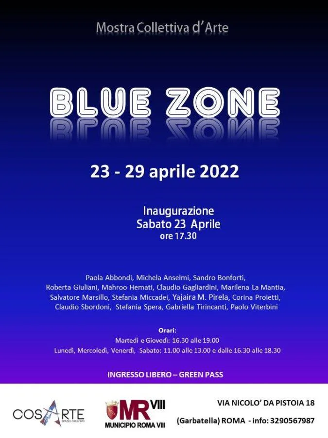 Dal 23 al 29 aprile 2022 si terrà la Mostra collettiva ‘Blue Zone’, con il patrocinio del Municipio Roma VIII, presso la galleria Cosarte nel cuore di Garbatella.