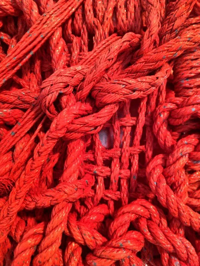 Emanuela Giacco utilizza le cime di recupero per le sue installazioni, la sua ricerca ha una matrice esistenzialista. La cima come simbolo dei legami che sono parte dell’esistenza di ogni persona. I legami come vincoli individuali.