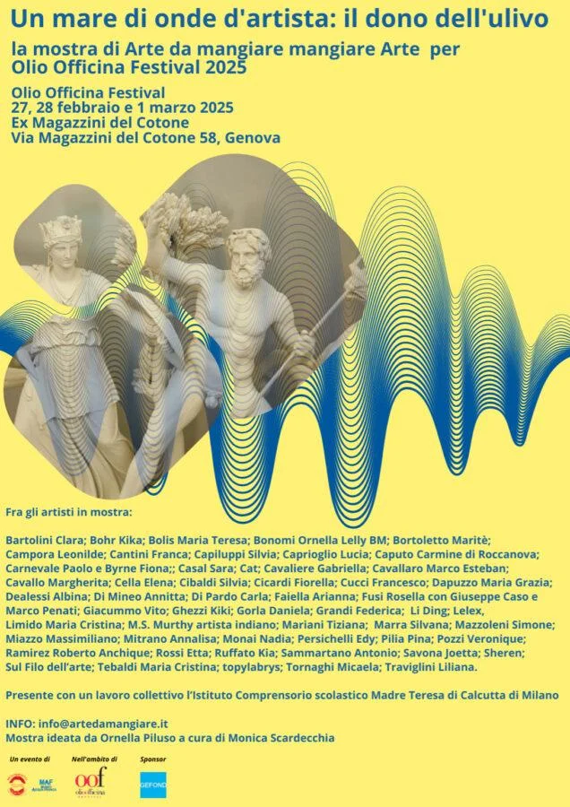 Tra le proposte più affascinanti di questa edizione spicca l’iniziativa dell’Associazione Culturale Arte da mangiare mangiare Arte, storico partner della manifestazione, che presenta la grande installazione collettiva “Un mare di onde d’artista: il dono dell’ulivo”.
