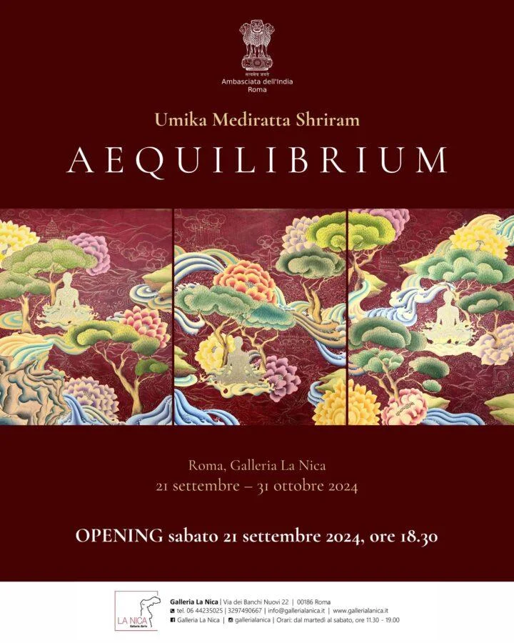 Sabato 21 settembre 2024 alle ore 18.30 verrà inaugurata alla Galleria La Nica di Roma, sita in via dei Banchi Nuovi 22, “Aequilibrium”, prima personale in Italia dell’artista indiana contemporanea Umika Mediratta Shriram. L’evento, che apre la nuova stagione espositiva de La Nica, ha ottenuto altresì il patrocinio dall’Ambasciata dell’India di Roma.