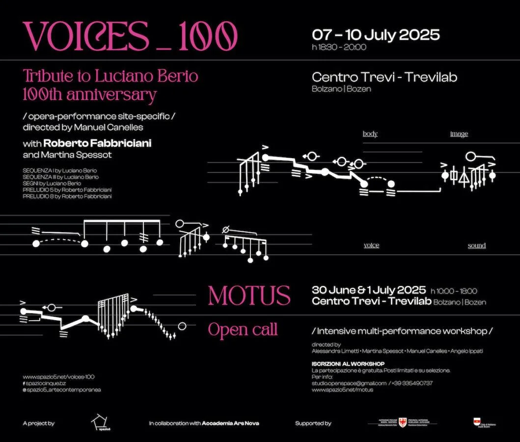 Dal 7 al 10 luglio 2025, il Centro Trevi di Bolzano ospita il progetto VOICES_100 - Tributo a Luciano Berio per i 100 anni dalla nascita del compositore, promosso da Spazio5 artecontemporanea. Inaugurazione 7 luglio 2025 dalle 18.30 alle 20.00.