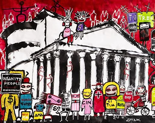 Il contrasto tra la monumentalità dei soggetti e la vivacità pittorica dà vita a un effetto immersivo. Lo spettatore è invitato a entrare in una Roma immaginata ma profondamente vera, fatta di scorci noti e momenti sfuggenti, di umanità ed energia. Accanto ai grandi formati, anche opere più piccole, realizzate con acrilico e matita, in cui figure ibride, tra fantasia e realtà, popolano le strade della città. Volti familiari e creature quasi oniriche si muovono tra piazze e palazzi, nel caos urbano, nei sogni metropolitani. I personaggi di Gentili raccontano una città dalle mille sfaccettature. Turisti aggrappati alle colonne, passanti sospesi sui tetti, corpi immersi nel traffico: è una Roma viva, contraddittoria, ironica. E, soprattutto, umana.