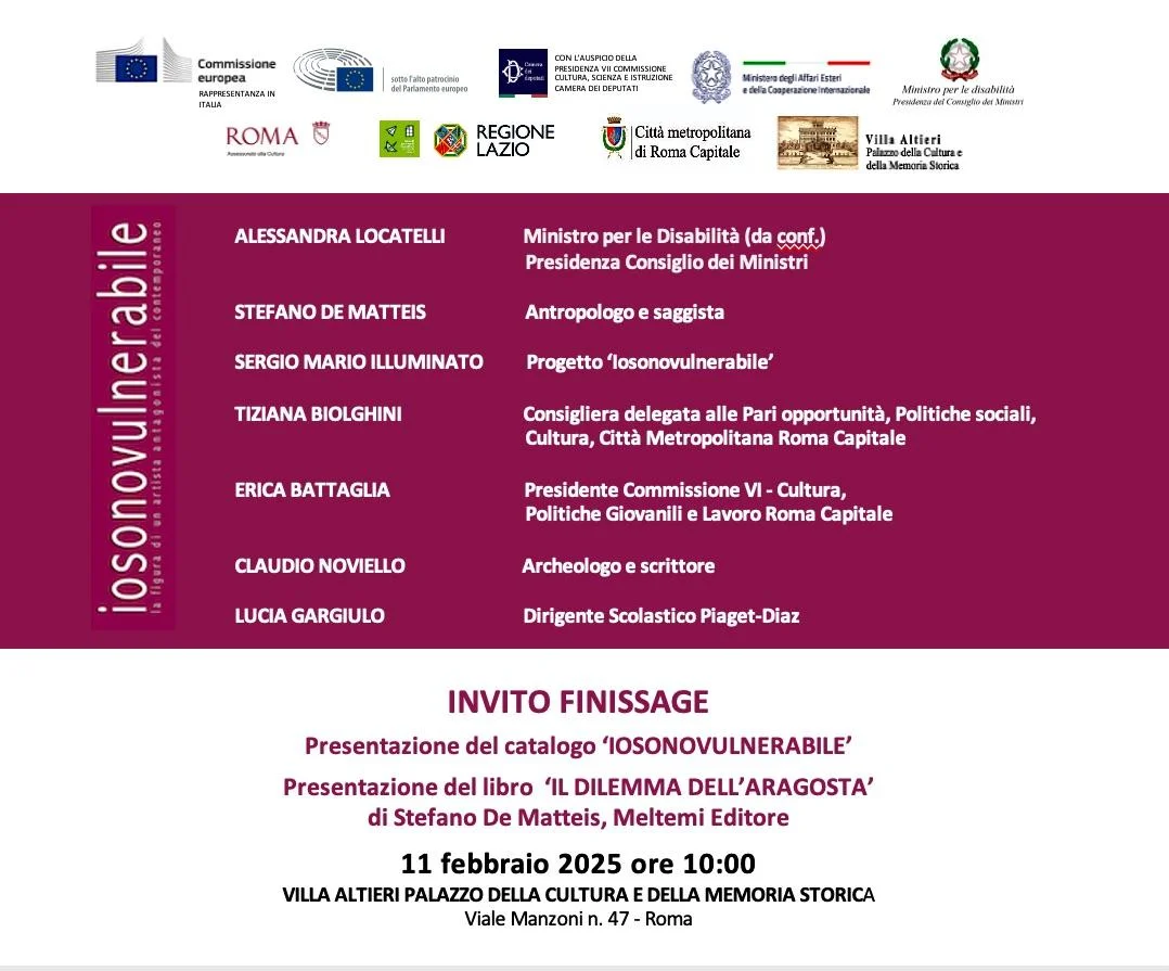 L'11 febbraio, alle ore 10, al Museo di Villa Altieri, si conclude il percorso artistico IOSONOVULNERABILE di Sergio Mario Illuminato con un incontro che riunisce studenti delle scuole romane, allievi dell'Accademia di Belle Arti, scrittori e rappresentanti istituzionali. L'evento segna l'ultimo capitolo di una narrazione visiva che affronta l'umanità nella sua finitezza e fragilità, contrapponendosi all'ideologia contemporanea dell'efficienza e della performance.