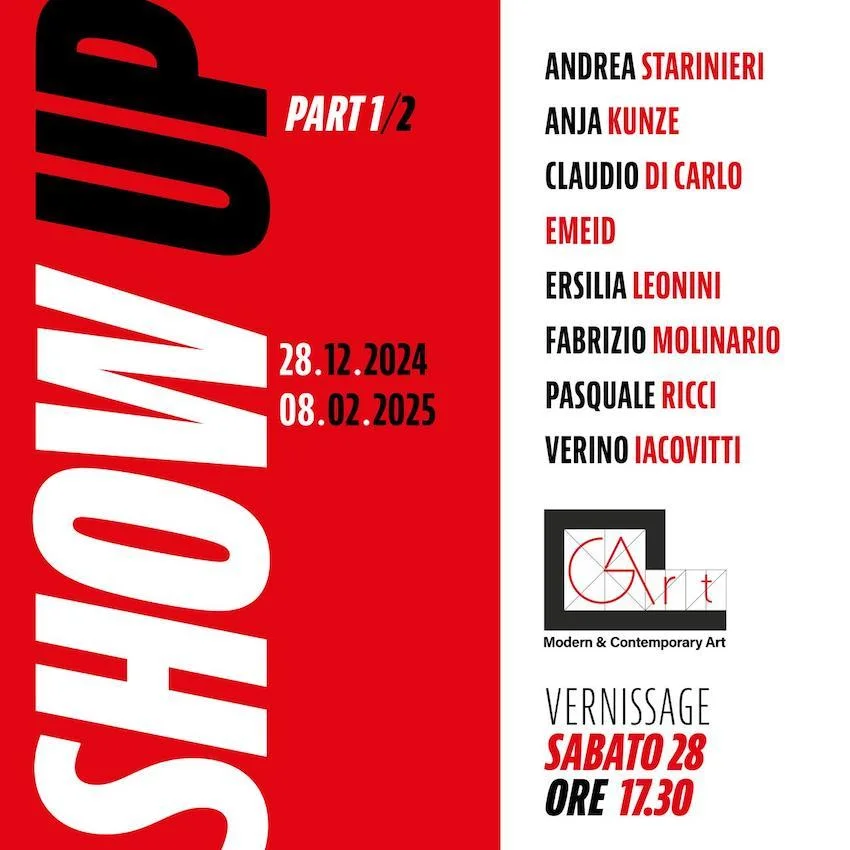 Sabato 28 dicembre dalle ore 17.30 la GArt Gallery presenta SHOW UP, vetrina di tutti gli artisti attualmente in forza alla galleria pescarese e in mostra presso la sede espositiva di via Gobetti a Pescara. L’esibizione collettiva si articolerà in due parti (Part 1/2 e Part 2/2) al fine di garantire maggiore spazio e visibilità a ciascun artista sulle pareti della galleria.