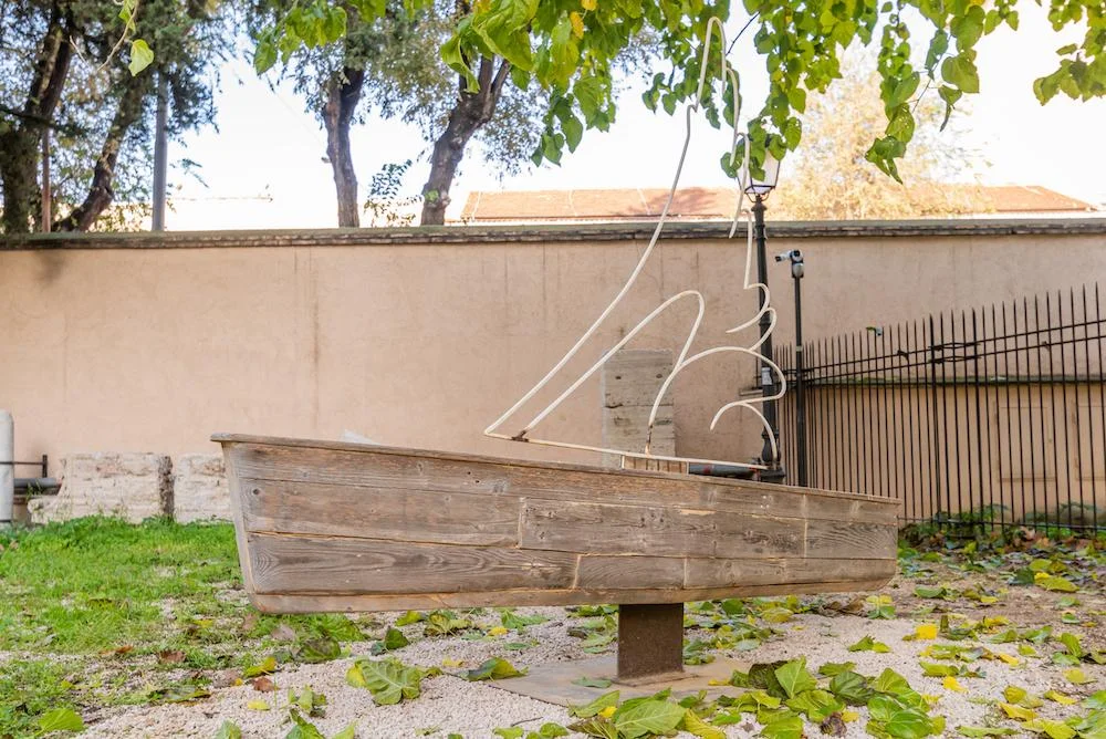ITACA di Michele Vasca (legno, ferro, 2023): Una scultura che esplora il rapporto tra eterno e divenire, con la barca come simbolo di viaggio e trasformazione. L’aggiunta di un’ala filiforme suggerisce una tensione tra reale e metafisico, incarnando intuizione e immaginazione.
