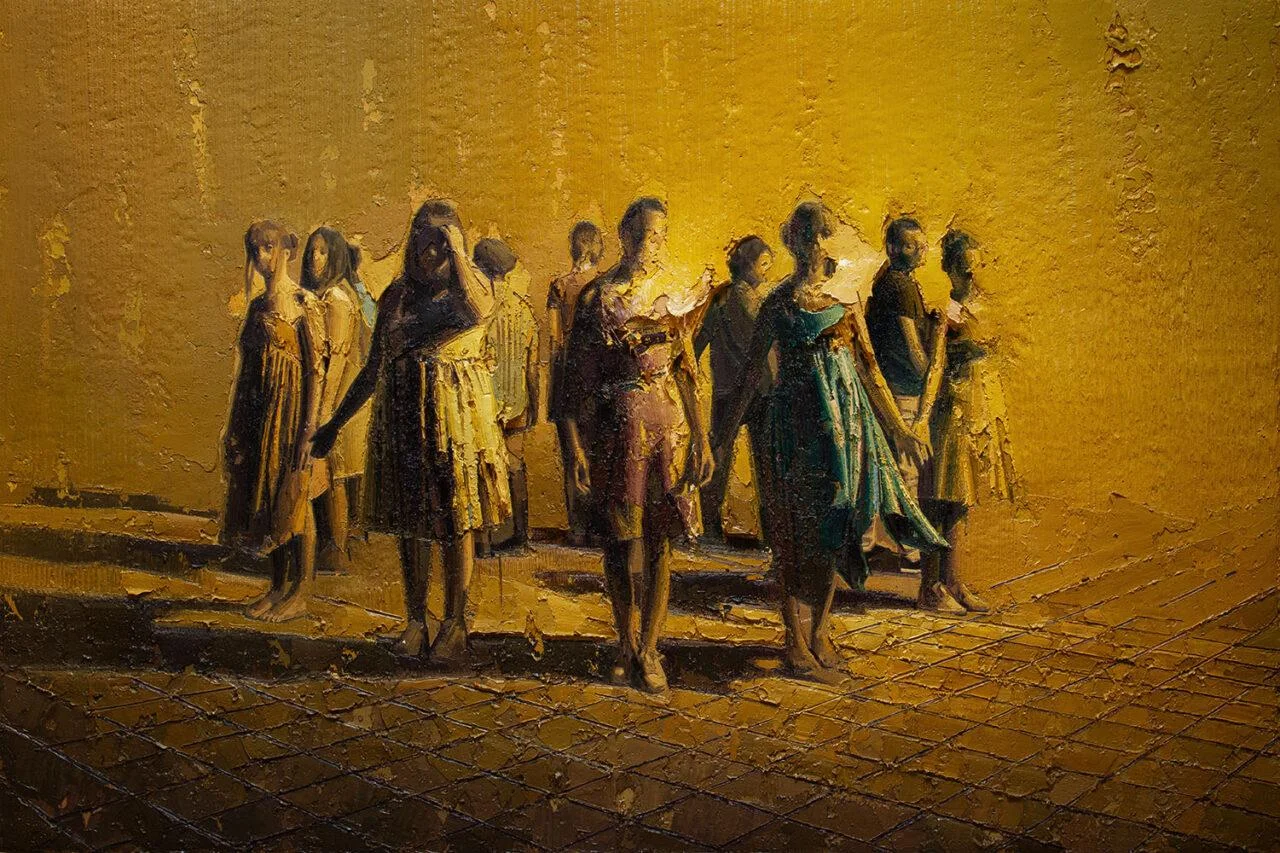 Giurato’s poetic universe masterfully merges classical tradition and contemporary sensitivity, giving life to works that oscillate between ancient and modern. His artistic practice reveals an inner dialogue between contrasting forces, transforming the canvases into narratives both dynamic and silent, capable of unleashing a powerful underground tension. The colour settles like a warm veil, while the light, steeped in drama, insinuates itself between the shapes, revealing their intimate fragility. In this balance of materiality and emotional tension, the artist sculpts, through his painting, not just shapes but also fragments of suspended humanity.